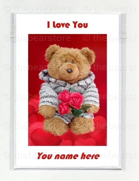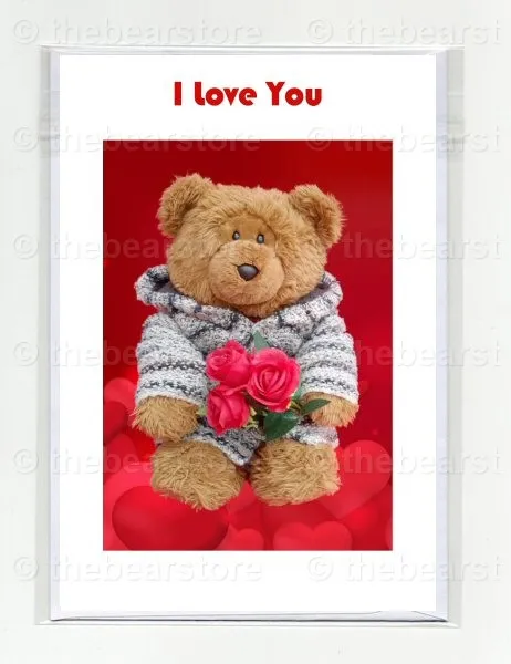 Greeting card featuring Billy holding 3 roses on a hearts background.