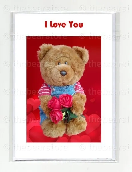 Greeting card featuring Douglas holding 3 roses on a hearts background.