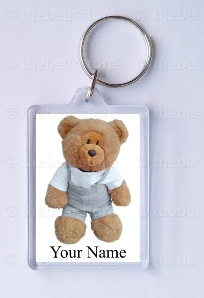 Keyring featuring Harlow in his jungle beach T shirt and grey dungarees.