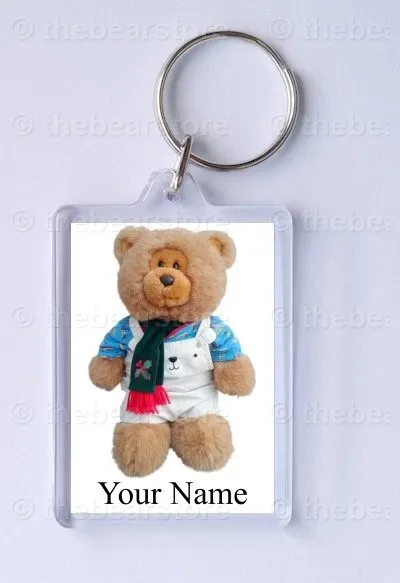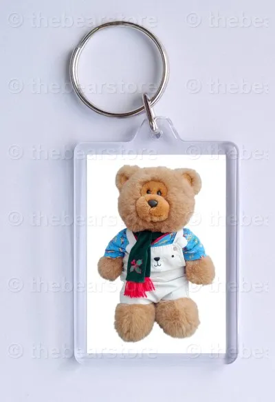 Keyring featuring Roly in his 'cars' T shirt, bear dungarees and green scarf.