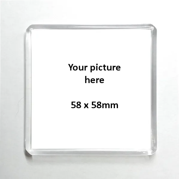 Picture size will be 58mm X 58mm placed inside a 65mm x 65mm x 5mm durable acrylic plastic magnet blank.