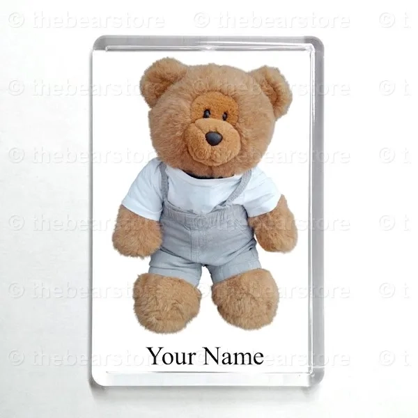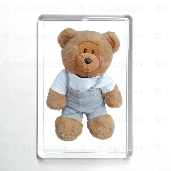 Oblong magnet featuring Harlow in his jungle beach T shirt and grey dungarees.