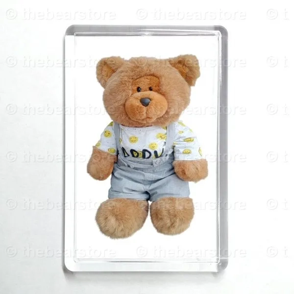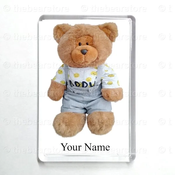 Oblong magnet featuring Riley in his HAPPY T shirt and grey dungarees.