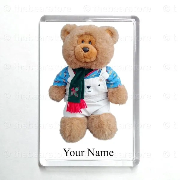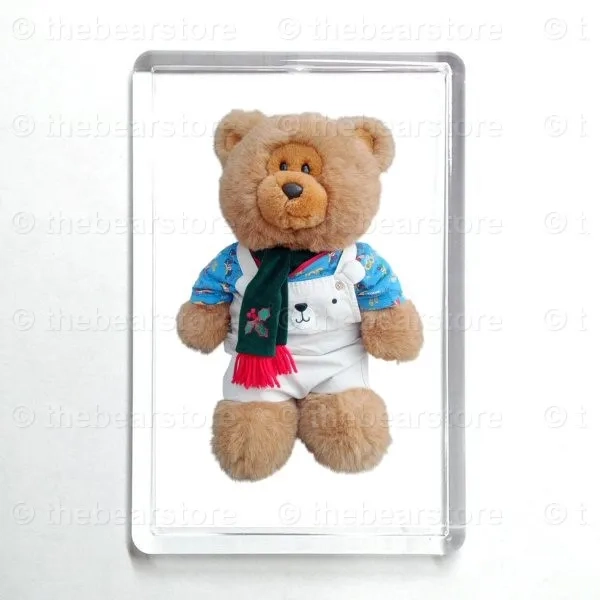 Oblong magnet featuring Roly in his 'cars' T shirt, bear dungarees and green scarf.