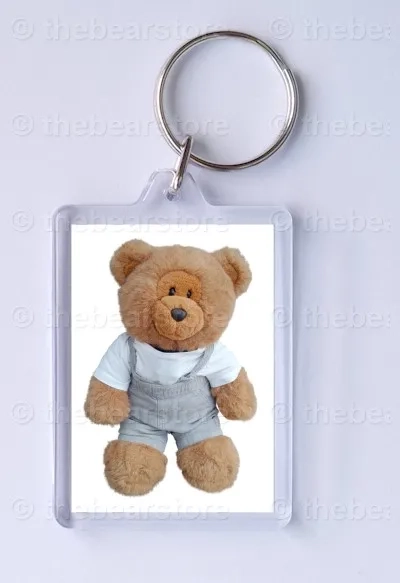 Keyring featuring Harlow in his jungle beach T shirt and grey dungarees.