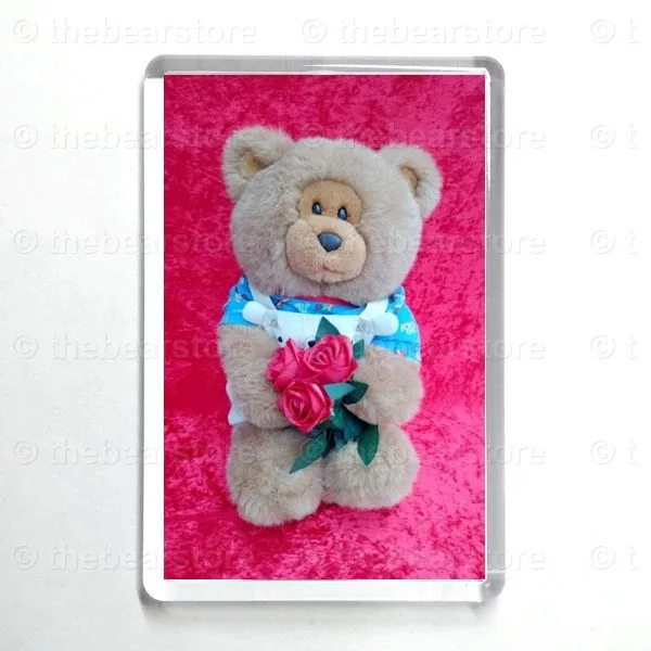 Oblong magnet featuring Roley holding 3 red roses.
